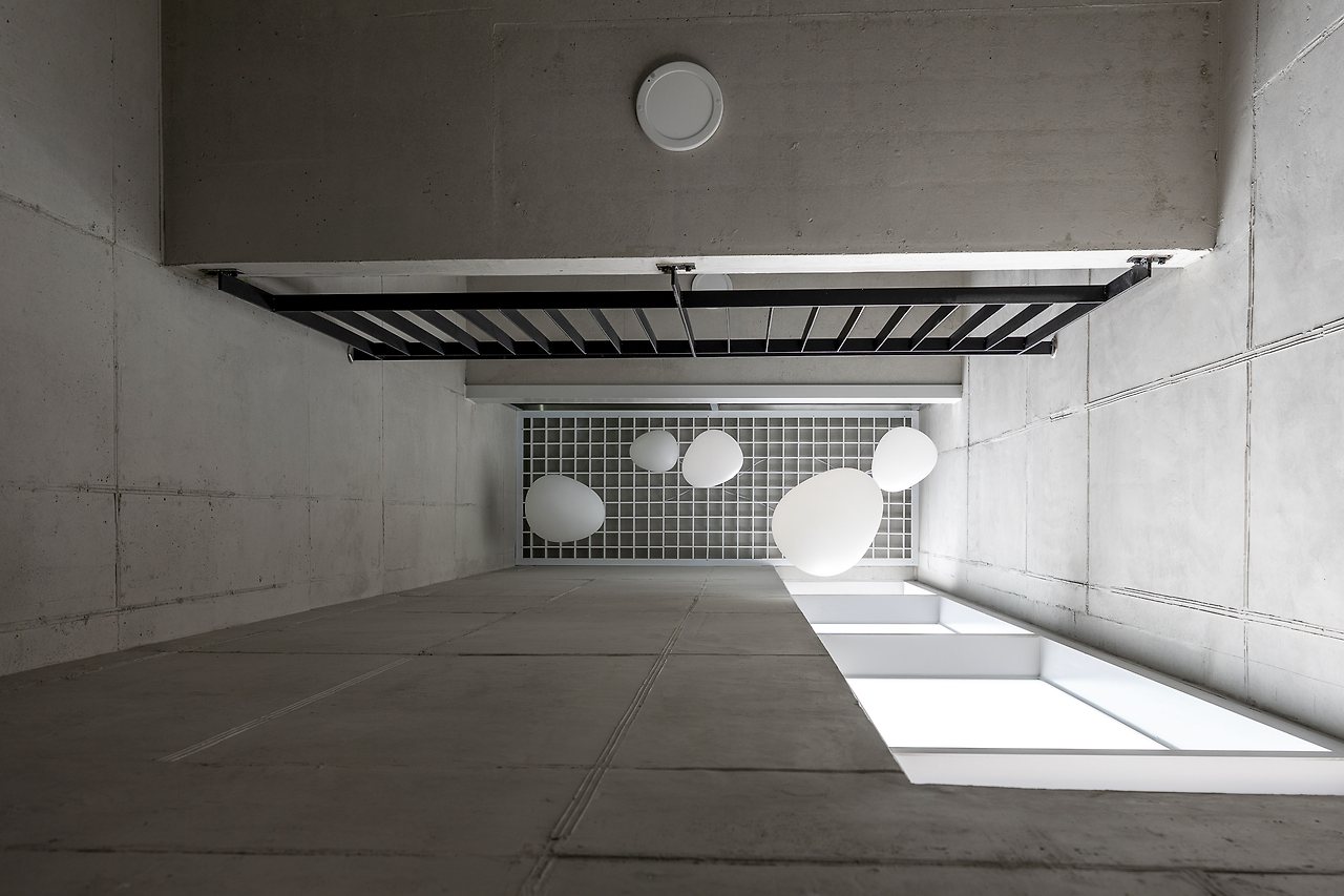 전면은 더블 스킨(double skin) 구조와 루버(louver)로 구성해 대형 매스를 분절하고, 동시에 프라이버시와 채광·환기를 확보했다. 1층은 유리 파사드로 열어 카페 등 다중이용시설을 유도하며, 밤에도 골목을 밝히는 ‘자연감시’의 역할을 한다. 공용부는 최소화 대신 수직 보이드(vertical void)와 넓은 계단실을 두어 입주자들이 빛과 바람을 공유할 수 있도록 계획했다.