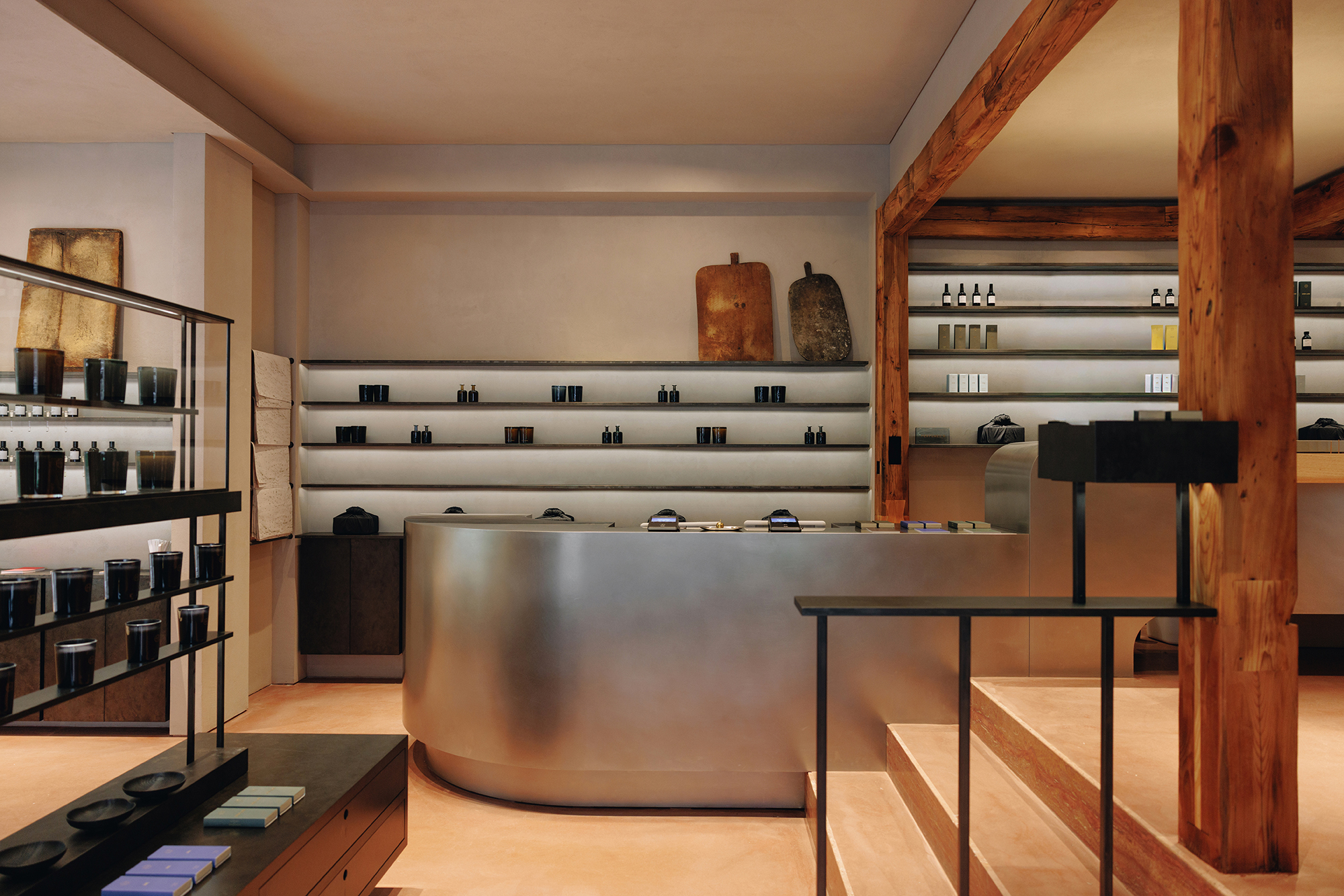 공원에 면한 1층에는 큰 창을 내어 내부 깊숙이 들여다볼 수 있게 했고, 2층은 코너 창과 가로로 긴 창을 만들어 도산공원을 파노라마처럼 바라볼 수 있도록 했다. 공원을 등지고 홀로 선 주변 건물과 달리 내외부의 소통을 적극적으로 이끌어내고자 한 시도다. 건물 앞에는 앞마당과 작은 목구조 파빌리온을 두어 상공간이 즐비한 거리에 숨통을 틔웠다. 건물 내부로 들어서면 브랜드의 이야기가 한층 선명해진다. 질감이 그대로 드러나는 목재와 벽돌, 콘크리트로 마감한 내부는 검박하고도 고즈넉한 분위기를 풍기는데 가구와 조명, 오브제까지 모든 디테일에 장인 정신이 깃들어 있다. 이는 단순한 장식이 아니라 장인 정신을 중요하게 여기는 브랜드의 철학을 반영한 결과다. 퍼퓨머 에이치는 향수를 담는 유리병부터 가구까지 다양한 라이프스타일 오브제를 장인의 손을 빌려 제작한다. 한국의 고목재와 장인이 정성껏 빚어 만든 벽돌, 공예가의 섬세한 손길로 완성한 기물이 공간 안에서 자연스럽게 어우러지며 퍼퓨머 에이치 서울 플래그십 스토어만의 인상을 만든다.