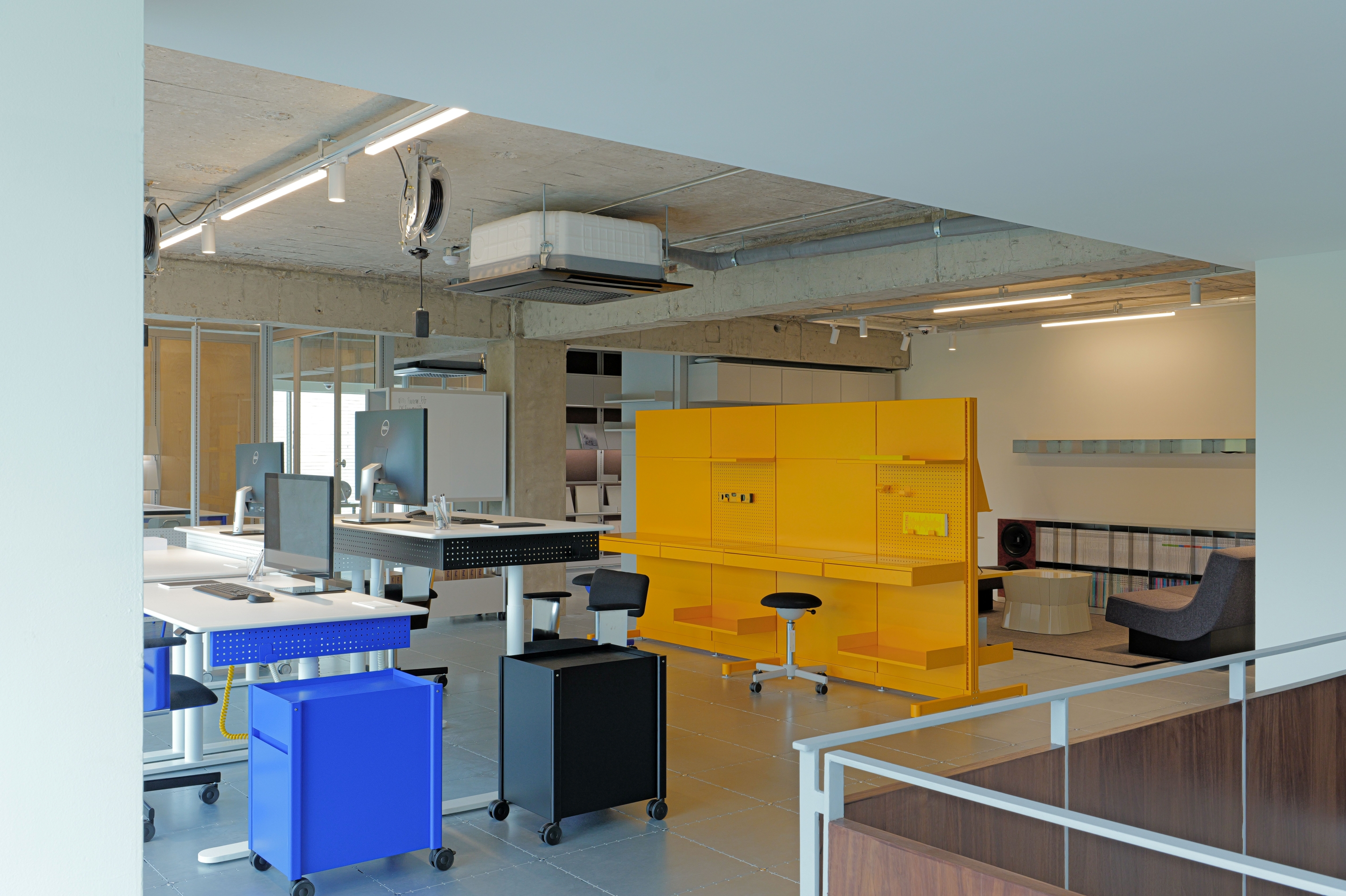 1층 입구로 들어서면 가장 먼저 약 6m 높이의 천장형 SYSTEM000 타워 구조가 상징적으로 자리한다. 스피커 모듈, 조명, 목재 등이 결합된 형태로 상업 인테리어의 새로운 구조적 가능성을 제안한다. 함께 전시된 룸 시스템(ROOM SYSTEM)은 설치와 해제가 자유로워 팝업 스토어나 전시 공간 등 변화가 잦은 상업 환경에서도 손쉽게 재구성할 수 있다.