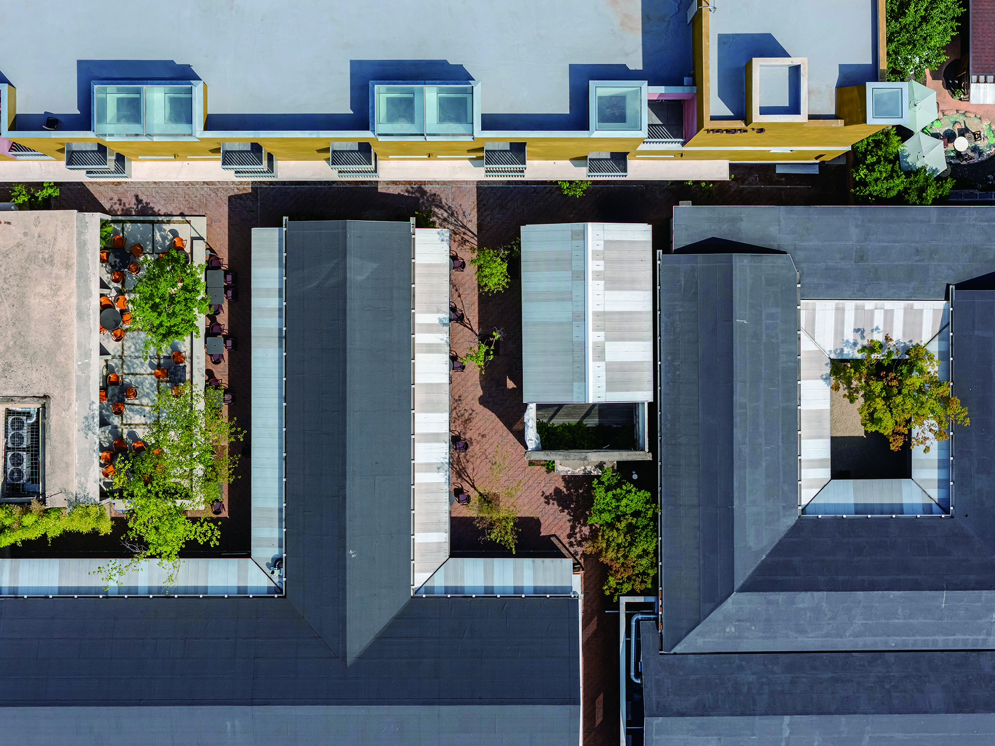 설계 후반 단계에 계획한 호텔은 인근에서 여관으로 사용하던 1960년대 건물을 신축한 것으로, 기존 블록 구조에서 파생된 공간 체계와 합을 맞추도록 했다. 객실 절반을 그라운드에 면하도록 구성해 외부 활동과의 연속성을 확보하고 나머지는 아트리움을 중심으로 배치했다. 8×1.2m의 천창이 설치된 아트리움은 자연광과 기후 요소를 내부로 끌어들이며 폐쇄된 도시 조직에 새로운 개방감을 부여한다. 재료는 화강암, 원목, 합판 등으로 내구성 확보를 우선 과제로 삼았는데, 이는 통상 10년을 주기로 리모델링하는 호텔의 관습을 탈피하기 위해서였다. 언제 방문해도 그 모습 그대로 기억되는 것이 소도시 호텔의 미덕이라고 봤다.