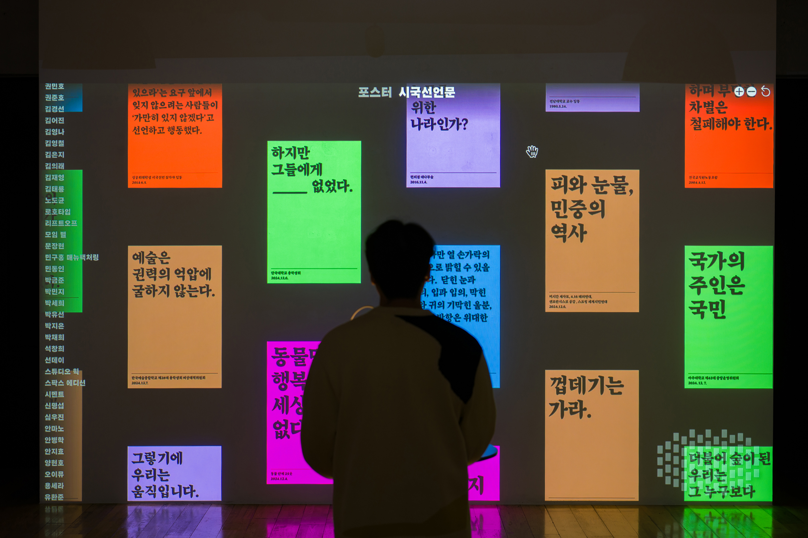 ‘시대의 사회적·정치적 위기 앞에서 디자이너가 무엇을 할 수 있는가’에 대한 질문에서 출발한 프로젝트다. 혐오와 분열, 언론의 왜곡, 권력의 무책임, 그리고 공적 언어의 붕괴를 경험한 일상의실천이 ‘디자인은 시대의 언어를 시각화하는 행위’라는 믿음 아래 프로젝트를 기획했다. 주축이 된 일상의실천 외에도 나이, 성별, 활동 영역이 서로 다른 63팀의 동시대 디자이너가 참여해 역사 속 시국 선언문을 각자의 언어로 시각화했다. 전시, 도록, 웹사이트(manifesto.ing)로 전개한 이 집단적 선언은 사회적 위기 속에서 디자이너의 역할과 디자인의 공공성을 다시 묻는 시도이며, 결국 디자인을 통해 시대의 징후를 관찰하고 공유하는 사회적 발언의 과정으로 확장되었다.