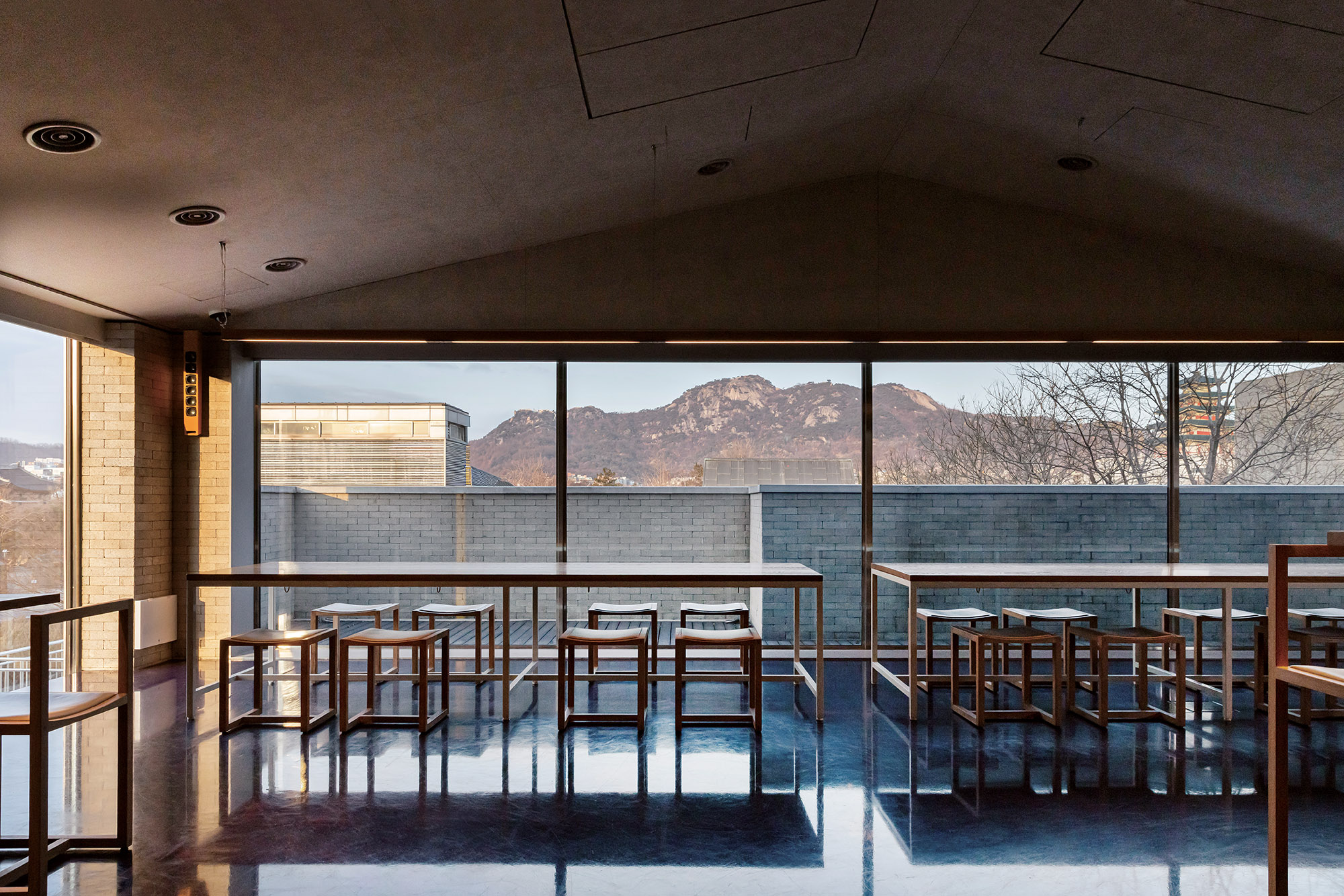 초기 일본 블루보틀 카페의 디자인을 맡은 스키마타 아키텍츠의 조 나가사카가 설계한 이곳은 1층부터 3층까지 이어지는 통유리창을 통해 경복궁과 인왕산, 주변 한옥 풍경을 내부로 끌어들이고 회색 벽돌, 나무, 코르크 등 절제된 재료의 조합으로 불필요한 요소를 덜어낸 블루보틀 특유의 따뜻한 공간 미학을 완성했다.