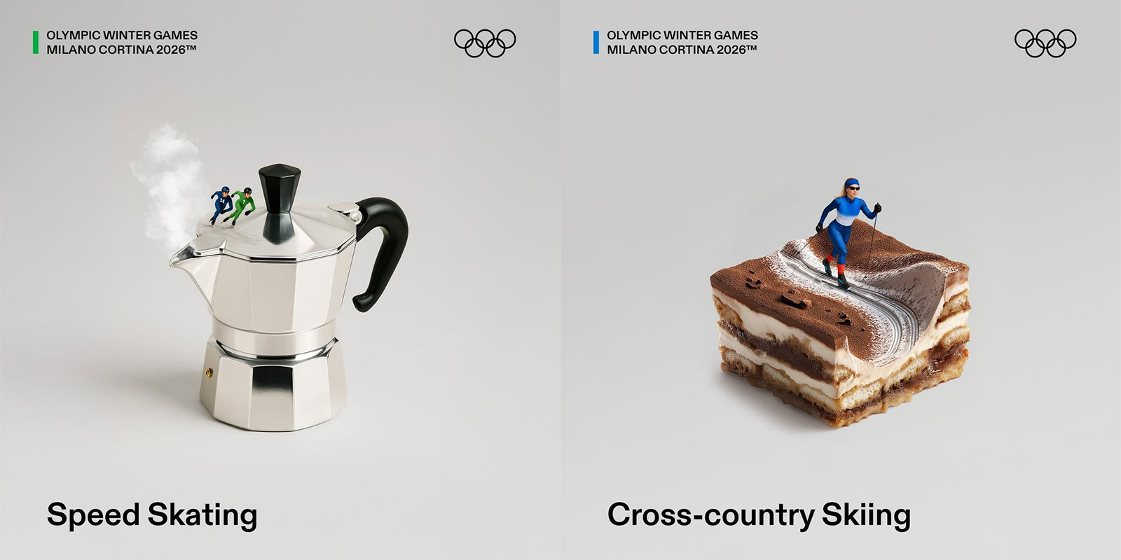 그 시리즈는 바로 이탈리아의 대표적인 식재료들을 활용한 종목별 포스터 시리즈다. 파스타는 루지 썰매가 되고, 아란치니는 스키 점프대로, 치즈는 컬링 스톤으로 변했다. 경기 장면을 직접적으로 묘사하기보다 이탈리아의 국가적 특성을 전면에 내세운 디자인으로, 미식의 나라라는 이미지와 전통 음식에 대한 자부심을 반영한 그래픽 시리즈다. 초현실적인 분위기와 위트를 더한 이 포스터들은 공개 직후 빠르게 확산되며 올림픽의 또 다른 시각 콘텐츠로 주목받고 있다.