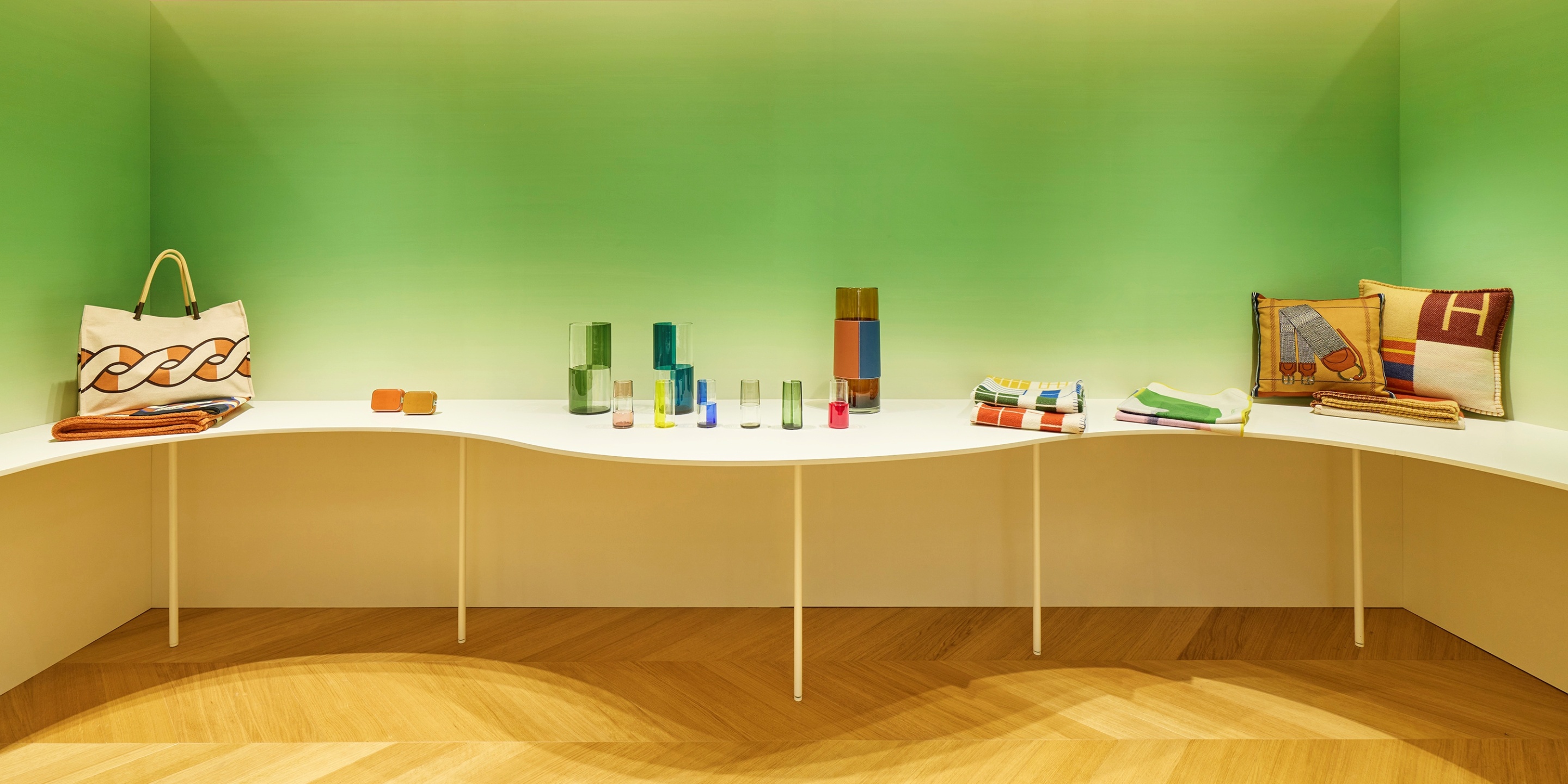 하늘과 바다가 맞닿은 수평선을 연상시키는 블루 톤의 클래식 존을 지나면 한층 깊고 몽환적인 블루의 이브닝·주얼리 존, 산뜻한 그린 팔레트의 홈 컬렉션 존이 이어진다. 카테고리의 영역마다 색조가 달라지면서 분위기가 전환된다. 그 안에 놓인 오브제들도 자연스럽게 맥락을 갖는다.