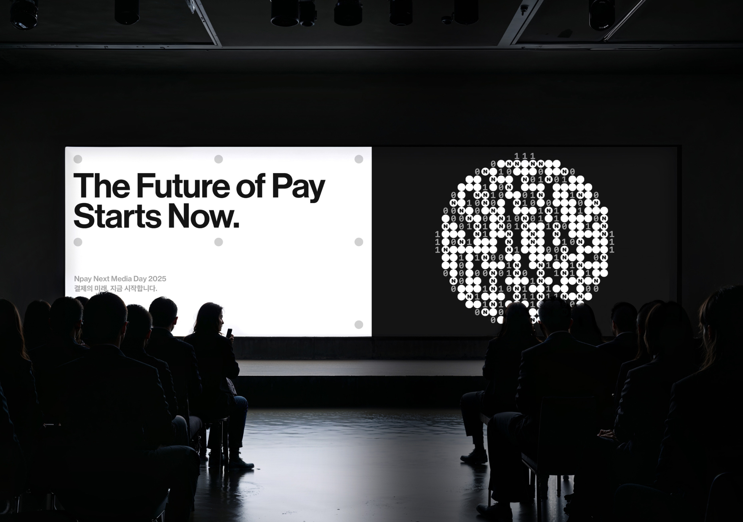 10주년의 무게는 증명인 동시에 예고다. 쌓아온 것을 보여야 하고, 앞으로 갈 방향도 선언해야 한다. 이는 엑스와이지가 맡은 네이버페이 10주년 콘퍼런스, Npay 넥스트 미디어데이 2025의 아이덴티티 디자인이 해결해야 할 과제였다. 화려한 이벤트성 비주얼이란 접근은 일찌감치 버렸다. 10년이란 시간성을 희석할 위험이 있고, 무엇보다 디자인 스스로 미래성과 기술성을 체감하게 만들어야 했기 때문이다. 과거와 내일이란 두 축을 함께 세우기 위해 엑스와이지는 ‘넥스트(Next), 테크(Tech), 커넥트(Connect)’라는 세 키워드를 설정하고, 이를 하나의 시스템으로 구조화하는 방식을 택했다. 콘셉트는 브랜드 자산 안에서 발견했다. 네이버페이 심벌의 원, 포인트 시스템이 상징하는 순환의 구조, 10주년을 구성하는 숫자 1과 0, 이 세 가지가 이진법이라는 기술적 맥락 안에서 하나로 포개진다는 것을 짚어낸 것이다.