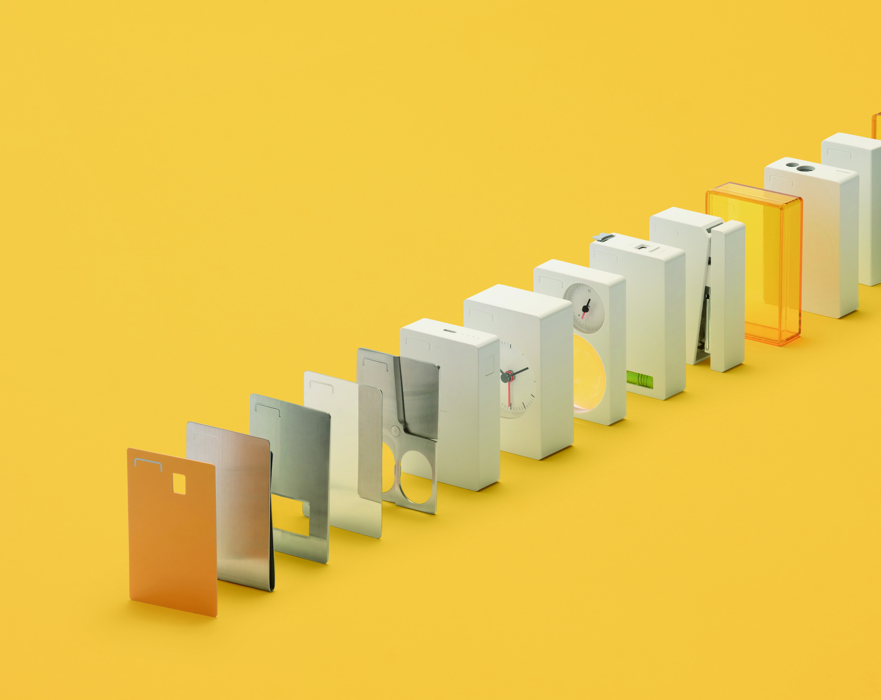 새롭게 론칭한 아워툴즈 역시 카드 형태에서 착안한 것이 특징이다. ‘현대카드 초콜릿’(2009), ‘현대카드 티Tea’(2011), 생수인 ‘아워 워터Our Water’(2019) 등으로 이어진 ‘아워 시리즈’의 계보를 잇는 이 디자인은 현대카드의 철학이 단순히 시각적 즐거움을 전하는 것이 아니라 신용카드라는 철저한 본업으로부터 비롯되었음을 또 한 번 알린다. 15가지 종류의 도구로 구성한 이번 스테이셔너리 키트 아워툴즈는 1:1.58의 카드 비율을 제품의 크기와 형태에 그대로 적용했다. 일상의 도구가 직사각형 몰드 안에서 주조된 듯 동일한 크기로 제작했다. 나침반 기능을 더한 돋보기, 심플한 러기지 태그와 보조 배터리, 직관적으로 카드를 떠올리게 하는 오프너 등 실용적이면서도 우아한 외형으로 기존 현대카드의 디자인 궤적을 따르고 있다. 평면에 가까운 카드를 입체의 도구로 환산하는 모든 과정은 현대카드 디자인랩에서 직접 진행했다고.