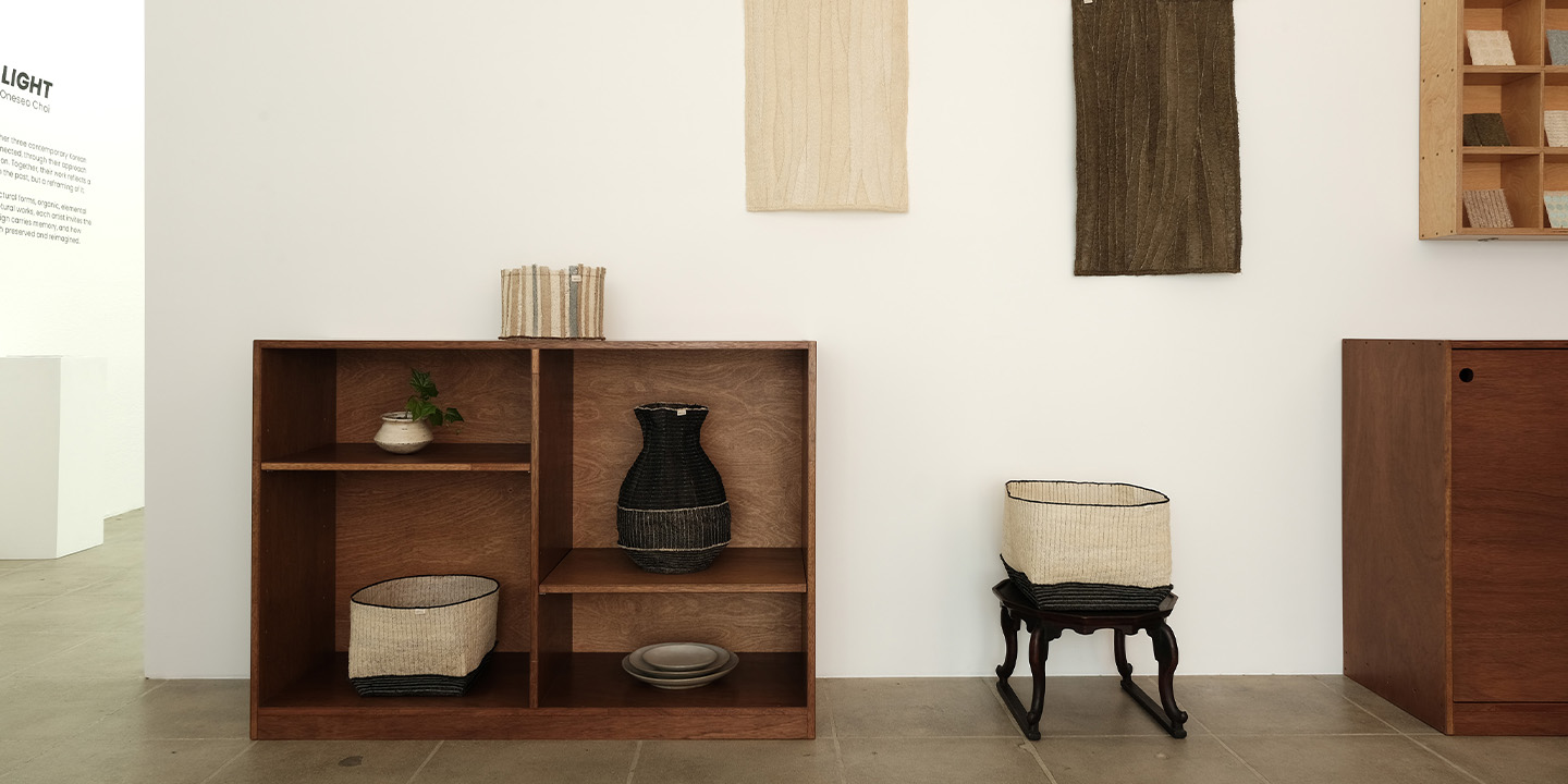 특히 이번 전시에서는 ‘Shape of Autumn 시리즈’가 눈길을 끈다. 호박을 닮은 볼륨감 있는 펜던트 조명은 거친 질감을 그대로 살리면서도 라인 스티치와 노출된 솔기를 통해 균형 잡힌 형태를 완성했다. 세 가지 색으로 물들인 수세미 조각을 이어 붙인 스트라이프 패턴 바스켓은 가을의 깊고 풍성한 층위를 연상시킨다. 정제됨과 날것의 긴장감이 하나의 형태 안에서 공존하길 바랐다고. 김예지 작가의 작업은 단순히 ‘친환경’ 소재를 사용하는 데 그치지 않는다. 재료 선택부터 제작 과정, 결과물이 오랜 시간 쓰일 수 있는가까지 고려하는 태도 자체가 지속 가능성에 대한 그의 해석. 크래프트가 삶과 밀접하게 맞닿아 있는 만큼 오래 곁에 두고 쓸 수 있는 오브제를 만드는 것이야말로 진정한 지속 가능성이라는 것이다.